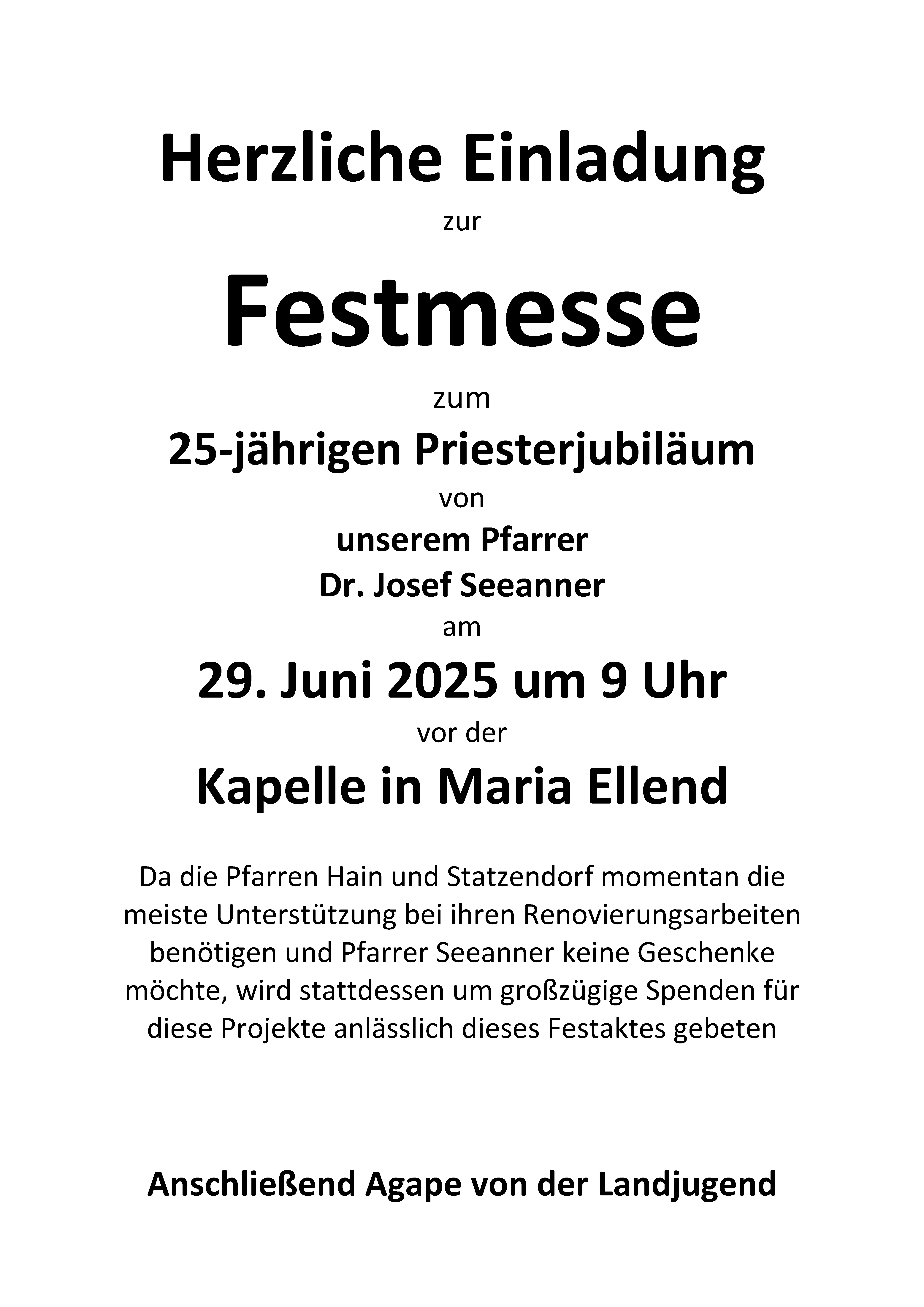 Am 29. Juni begeht unser Pfarrer Dr. Josef Seeanner sein 25-jähriges Priesterjubiläum. Dazu findet in Maria Ellend eine gemeinsame Festmesse statt. Anschließend gibt es eine Agape der Landjugend. Spenden kommen den Renovierungsarbeiten in den Pfarren Hain und Statzendorf zu Gute.