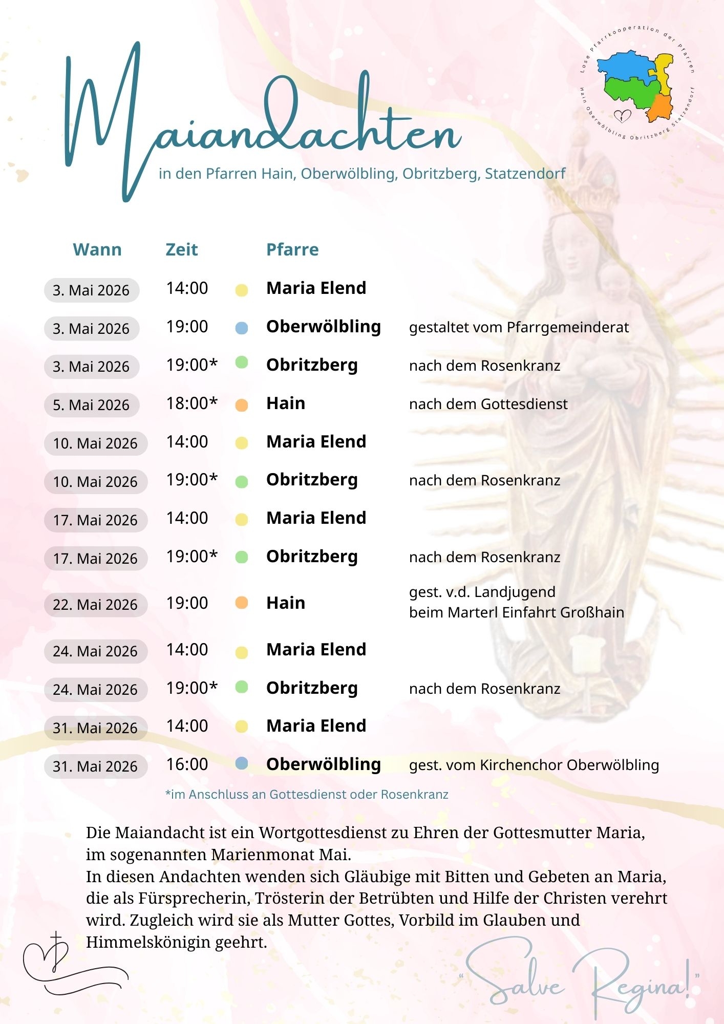 Im Mai finden in den vier Pfarren regelmäßig Maiandachten statt, in denen sich die Gläubigen mit ihren Bitten und Gebeten an die Gottesmutter Maria wenden.