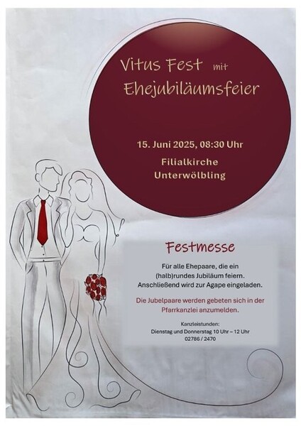 Am 15. Juni gibt es in der Filialkirche Unterwölbling doppelten Grund zur Freude. Einerseits wird das Vitus-Fest gefeiert, andererseits steht die Festmesse im Zeichen der (halb)runden Ehejubilare. Jubelpaare können sich noch in der Pfarrkanzlei anmelden!